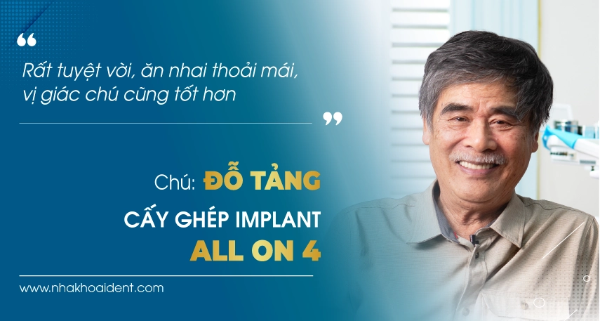 Chú Đỗ Tảng (Việt kiều Mỹ ) đã chia sẻ rằng không thể tưởng tượng được khi trải qua quá trình làm Implant lại nhẹ nhàng và nhanh chóng đến vậy. “Nếu chọn lại chú sẽ chọn trồng răng Implant sớm hơn. Răng Implant thật sự rất tuyệt vời, ăn nhai thoải mái, vị giác chú cũng tốt hơn” .
