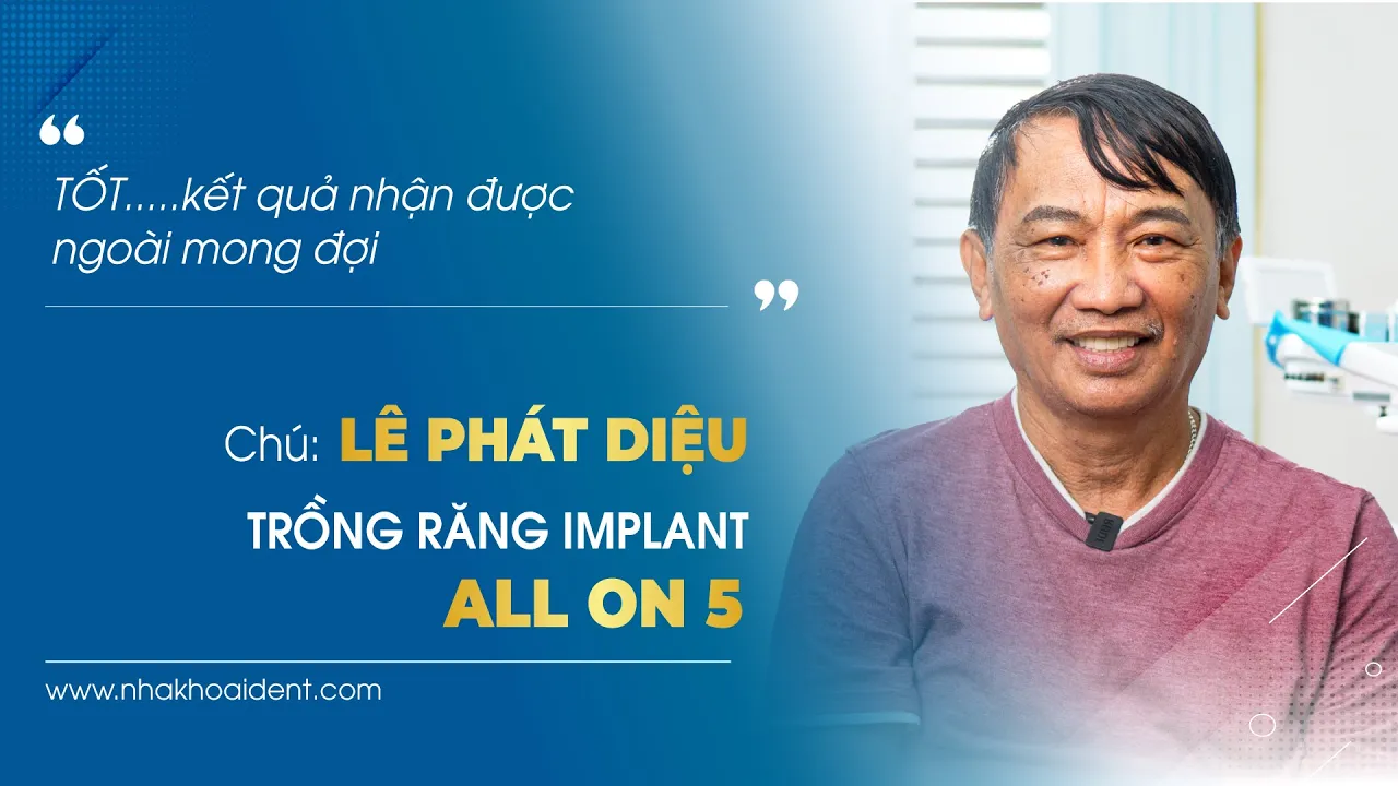 Chú Diệu Phát được bác sĩ chỉ định nhổ các răng lung lay và tiến hành cấy ghép 2 hàm Implant All On 5. Tiến sĩ – Bác sĩ Nguyễn Hiếu Tùng trực tiếp thực hiện phẫu thuật cắm trụ cho chú và toàn bộ quá trình diễn ra nhẹ nhàng, thoải mái. Khi về nhà chú cũng không bị sưng đau nhiều.