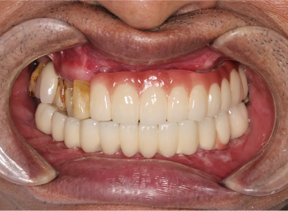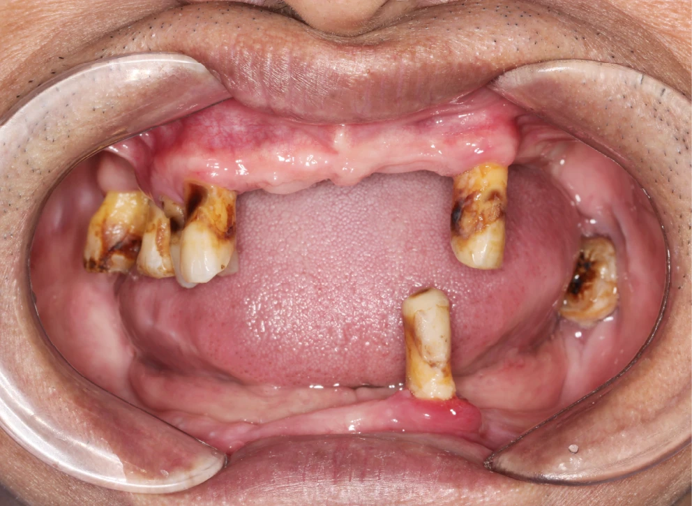 - Tình trạng răng trước đây:Mất nhiều răng ở hàm trên và chỉ còn 1 răng ở hàm dưới, mắc viêm nha chu nặng. Từng dùng hàm tháo lắp.