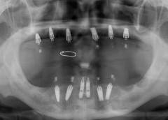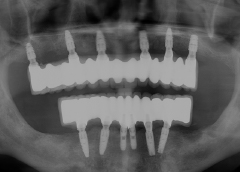 - Phương hướng điều trị:Phục hình lại toàn bộ hàm trên bằng phương án cấy ghép Implant All On 6. Cắm 6 trụ Implant và phục hình hàm sứ cố định.