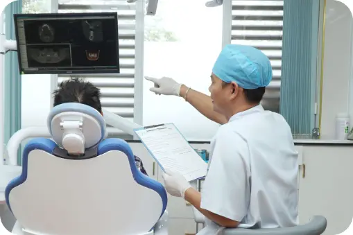 Khách hàng đến nha khoa thăm khám theo lịch hẹn đã đặt trước. Bác sĩ sẽ kiểm tra tổng quát tình trạng răng miệng và chụp phim CT Scanner 3D vùng răng hàm mặt, để biết chính xác chất lượng xương hàm cũng như vị trí răng mất của khách hàng.
