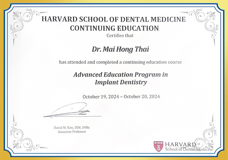 - Chứng chỉ chuyên sâu cấy ghép Implant toàn hàm All-on-X và GBR ĐH Harvard.
