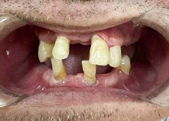 Chú Quốc Quân gặp rất nhiều khó khăn trong việc ăn uống vì mất răng cả 2 hàm. Phần nướu còn bị teo nhỏ, xương hàm tiêu biến do sử dụng hàm tháo lắp lâu năm.