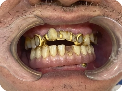Chú Anh Sơn từng lựa chọn làm cầu răng sứ cho các vị trí răng mất ở hàm dưới. Sau thời gian dài sử dụng, cầu răng bị hở và dễ mắc kẹt thức ăn gây viêm nhiễm. Chưa kể xương hàm dần tiêu biến gây tụt nướu, lộ chân răng, khiến nhiều răng bị lung lay và rụng dần.