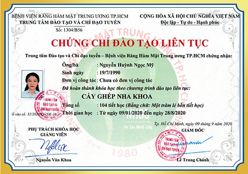 - Chứng chỉ Cấy ghép Implant Bệnh viện Răng Hàm Mặt Trung ương.