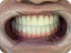 Với tình trạng này, bác sĩ Mỹ phải tiến hành điều trị nha chu và nhổ các răng lung lay nặng để ngăn ổ nhiễm trùng lan rộng. Sau đó ghép mô xương và đặt 4 trụ Implant, để đảm bảo thẩm mỹ cũng như chức năng ăn nhai cho chú.