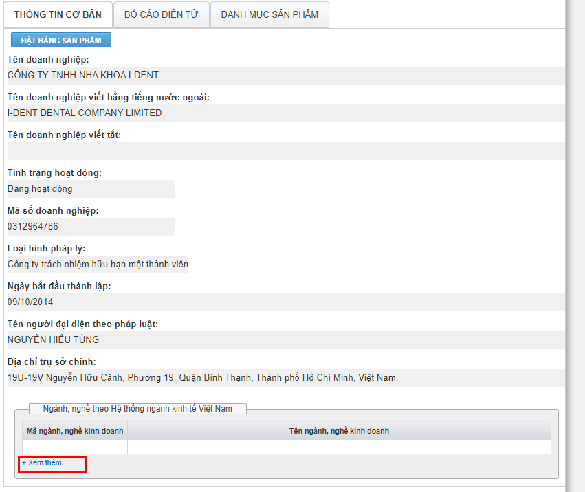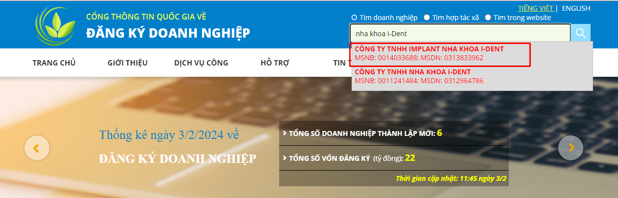 Bước 2: Nhập mã số thuế, hoặc tên doanh nghiệp vào ô tìm kiếm. và chọn Nha Khoa bạn đang tim kiếm. (Nếu không có nghĩa là cơ sở chưa được nhà nước kiểm định )