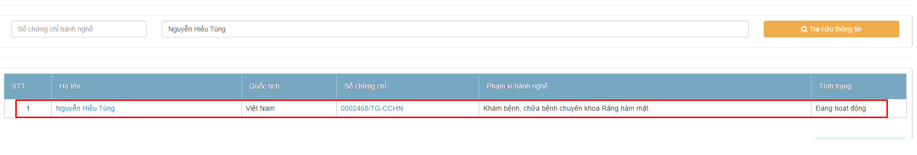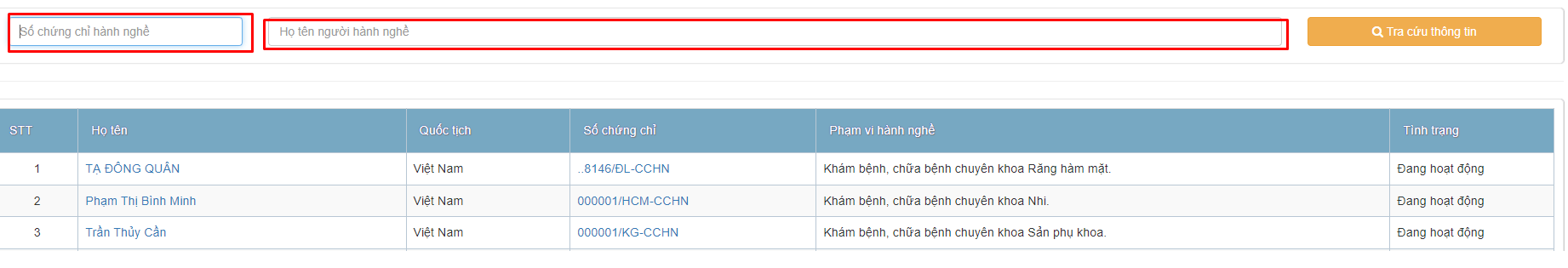 Bước 2: Nhập số chứng chỉ hành nghề hoặc nếu không có, nhập tên hoặc họ và tên bác sĩ vào ô tương ứng