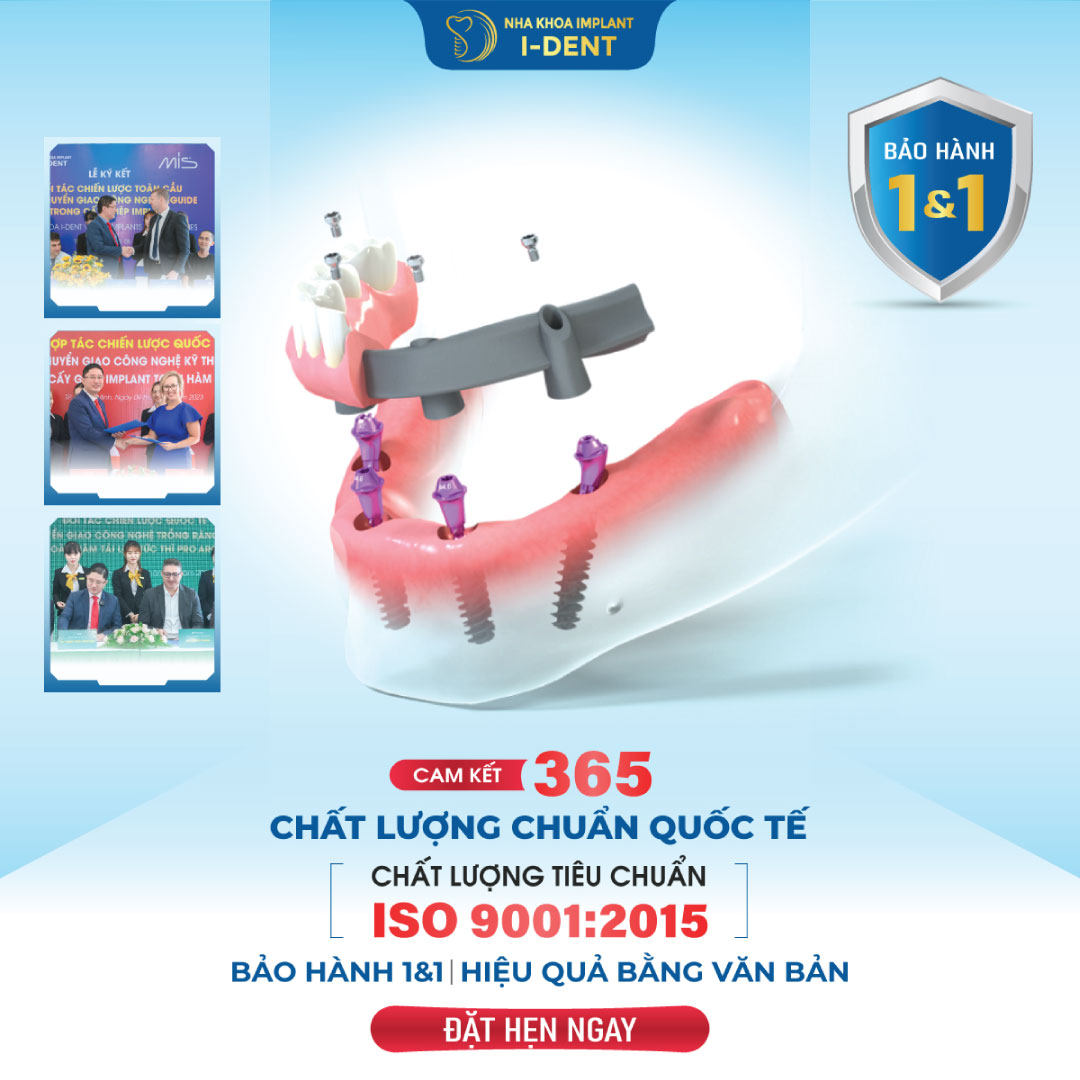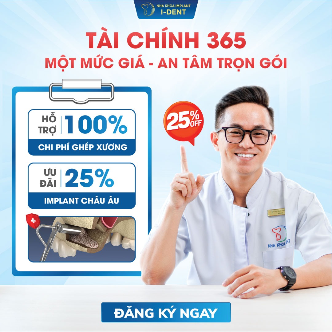 Trồng răng implant an tâm tuyệt đối với “Implant 365++” của Nha Khoa I-Dent. Chỉ sau 72 giờ cấy ghép, Cô Chú Anh Chị sẽ có răng tạm để sinh hoạt bình thường, và trong vòng 3 tháng (tối đa 2 năm tùy tình trạng) sẽ hoàn thiện răng sứ cố định. Chúng tôi cung cấp giải pháp trồng răng trọn gói với sự chăm sóc toàn diện suốt 365++ ngày, giúp khách hàng yên tâm từ khâu điều trị cho đến tài chính, hỗ trợ và cam kết hậu mãi. (Đặc biệt: hỗ trợ 100% chi phí ghép xương, bảo hành 1 đổi 1 đến 365++ ngày không phát sinh chi phí.