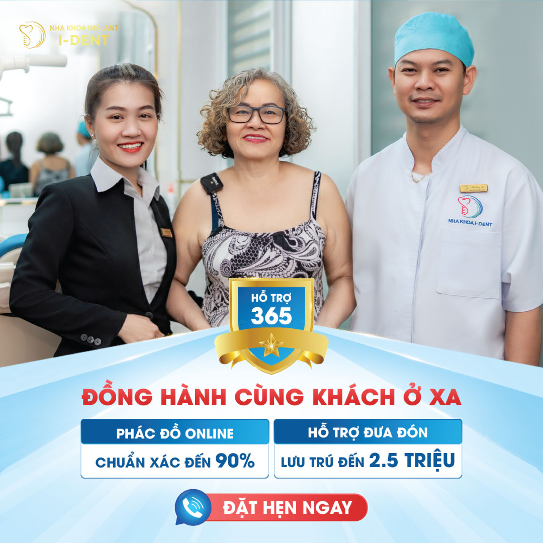 Hỗ trợ đi lại, lưu trú: I-Dent có dịch vụ đưa đón sân bay dành cho khách hàng ngoài TP.HCM. Đồng thời, chúng tôi hỗ trợ chi phí lưu trú (lên đến 2,5 triệu đồng) cho khách hàng ở xa trong thời gian làm răng, giúp Quý khách yên tâm nghỉ ngơi trong suốt quá trình điều trị.