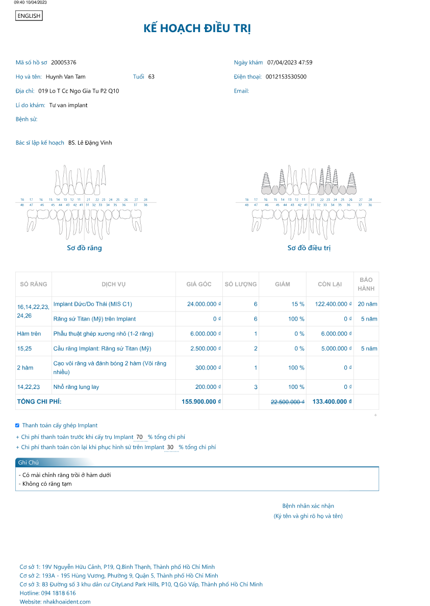 Cô chú anh chị sẽ nhận được phiếu kế hoạch điều trị đầy đủ như hình bên dưới và không bắt buộc điều trị tại Nha Khoa I-Dent