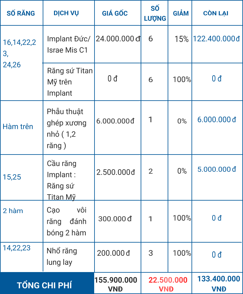 Toàn bộ chi phí dịch vụ điều trị sẽ được liệt kê như bảng bên dưới: